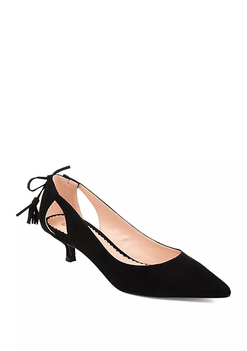 Pointed toe perfection comes with from the Bindi pump by Journee Collection. This classic kitten heel features a sleek pointed toe with side cut-outs and a fringe bow design that combines uniqueness and class.