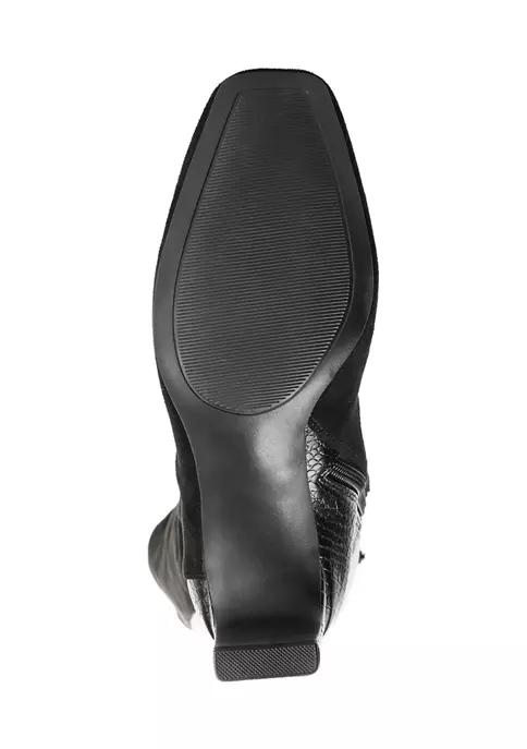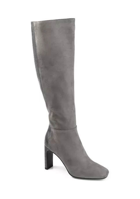 A fashion-forward look for fall, the Elisabeth boot by Journee Collection. Vegan leather two-toned details and a retro square-toe give this extra-wide calf boot a subtle twist. This chic design is finished with a zipper entry and a 4 mm Tru Comfort Foamโข insole.