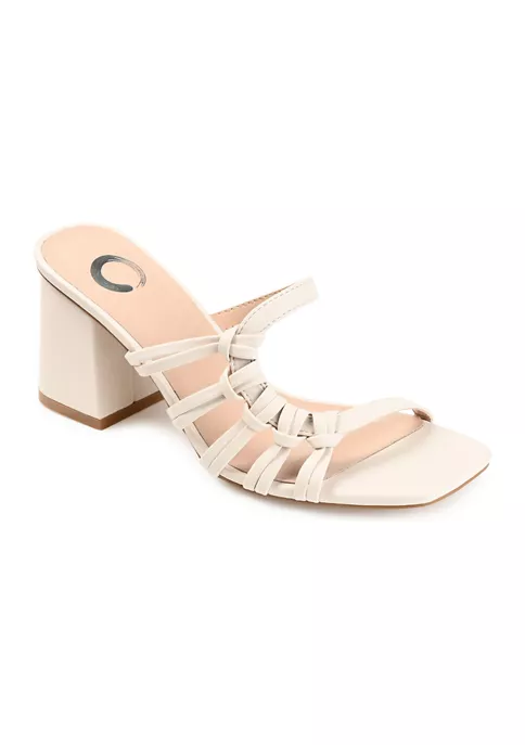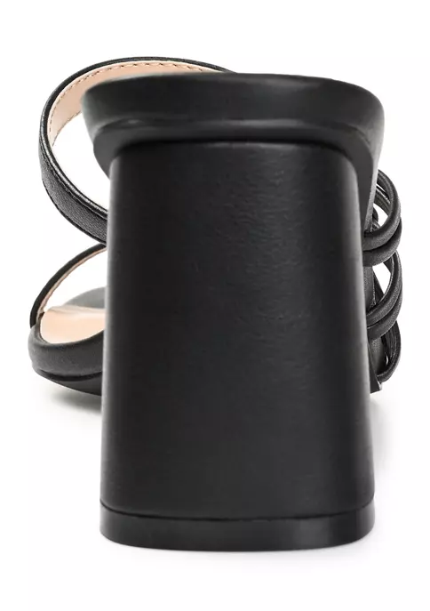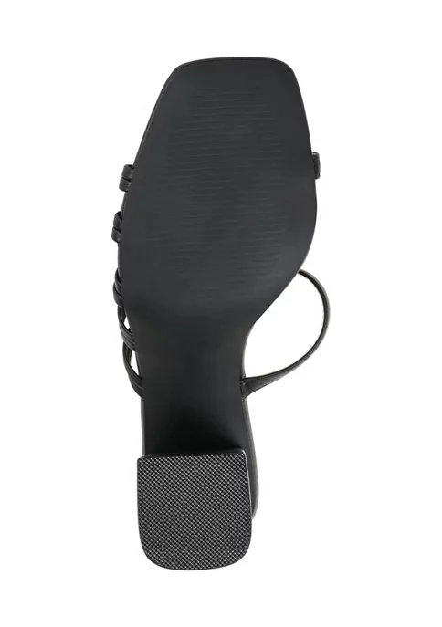 A slip-on heel you didn’t’ know you needed, the Emory by Journee Collection. This sleek slip-on style features soft vegan leather and a padded footbed for a supportive fit. Asymmetrical knotted straps and a covered block heel finish this modern look.