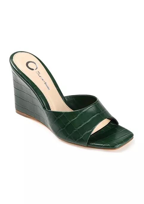 The comfortable heels you’ve been waiting for, the Vivvy by Journee Collection. This slip-on silhouette features croc textured vegan leather uppers complemented by a 4 mm Tru Comfort Foam™ footbed for a comfortable fit. A simple band at the toe and a lofty wedge heel define the shape.